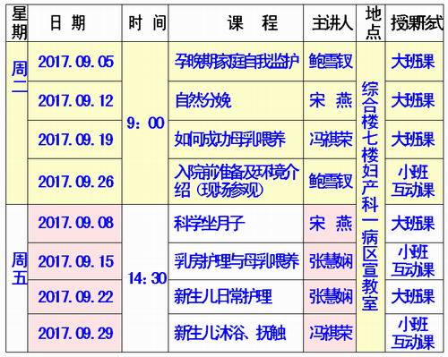 2017年9月份孕婦、育兒學(xué)校課程表(北部院區(qū))