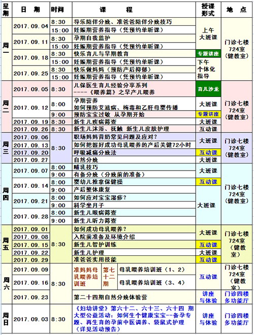 2017年9月份孕婦、育兒學(xué)校課程表(北部院區(qū))