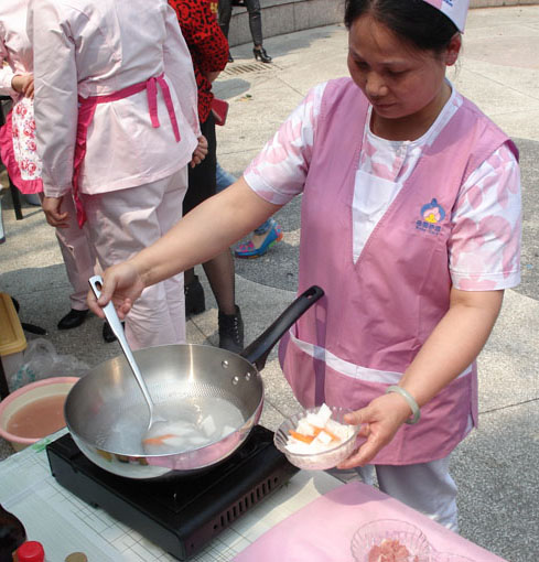 參賽選手們正在烹飪山藥炒肉片